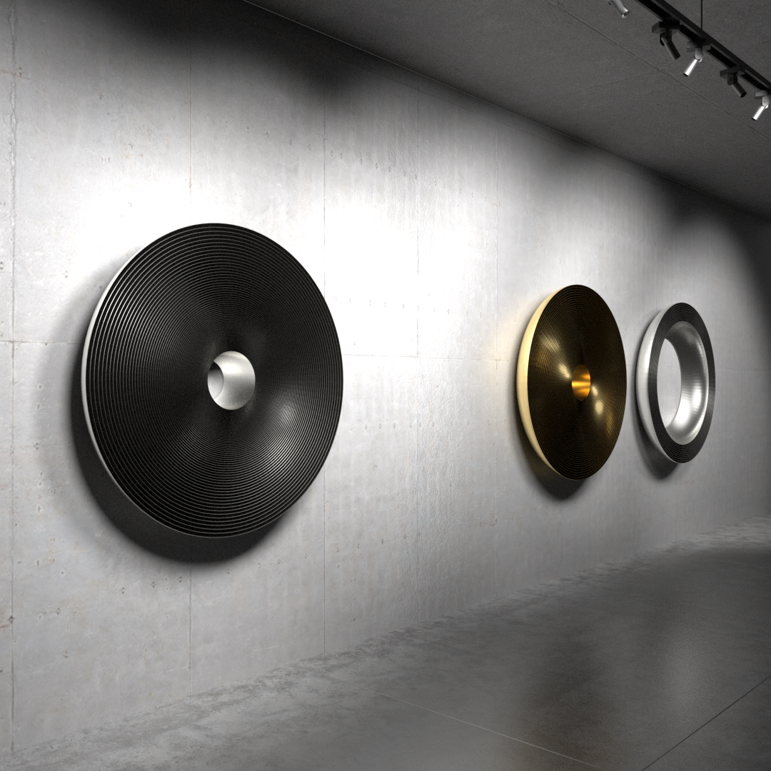 Industrial machinary inspired wall mounted minimalist sculptural objects.A celebration of elegant symmetrical precision contrasted by irregular lighting reflections on metal surface.